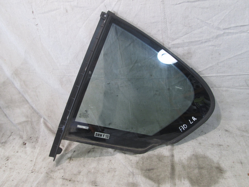 BMW F10 left rear quarter window. The image is a stock picture of the item. We have many windows in stock and the one pictured may or may not be the one you receive. Windows may have tint, writing, seals, trim, or stickers that may need to be removed once you receive the window.