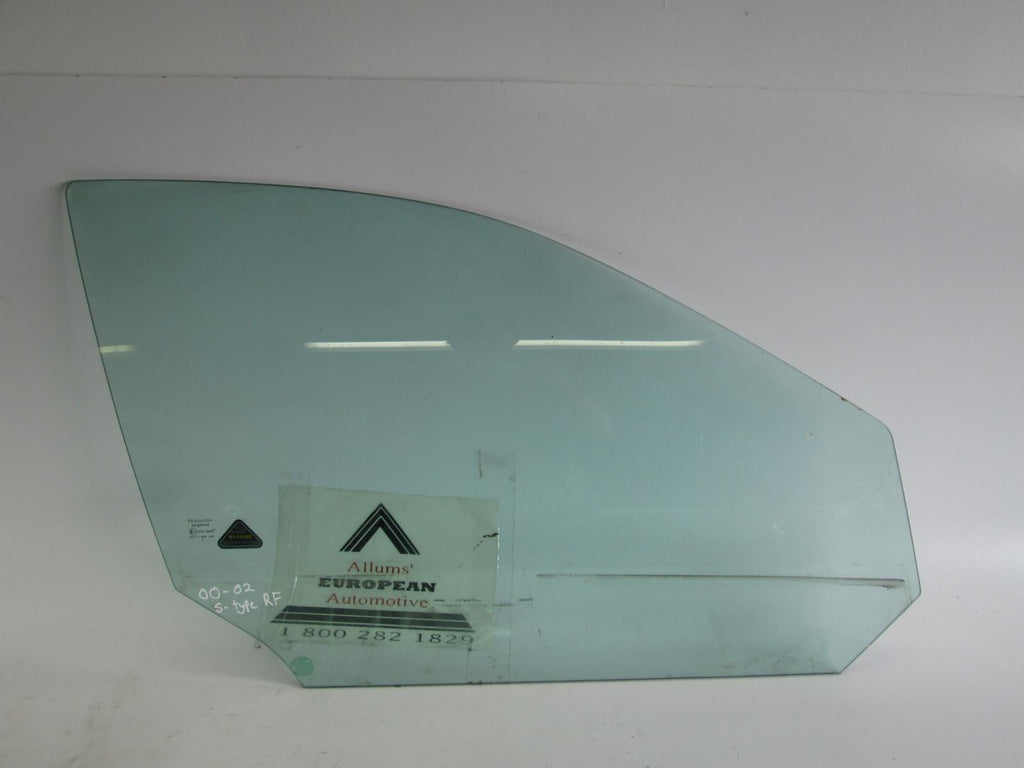 Jaguar S-Type 00-02 right front door window. The image is a stock picture of the item. We have many windows in stock and the one pictured may or may not be the one you receive. Windows may have tint, writing, seals, trim, or stickers that may need to be removed once you receive the window.