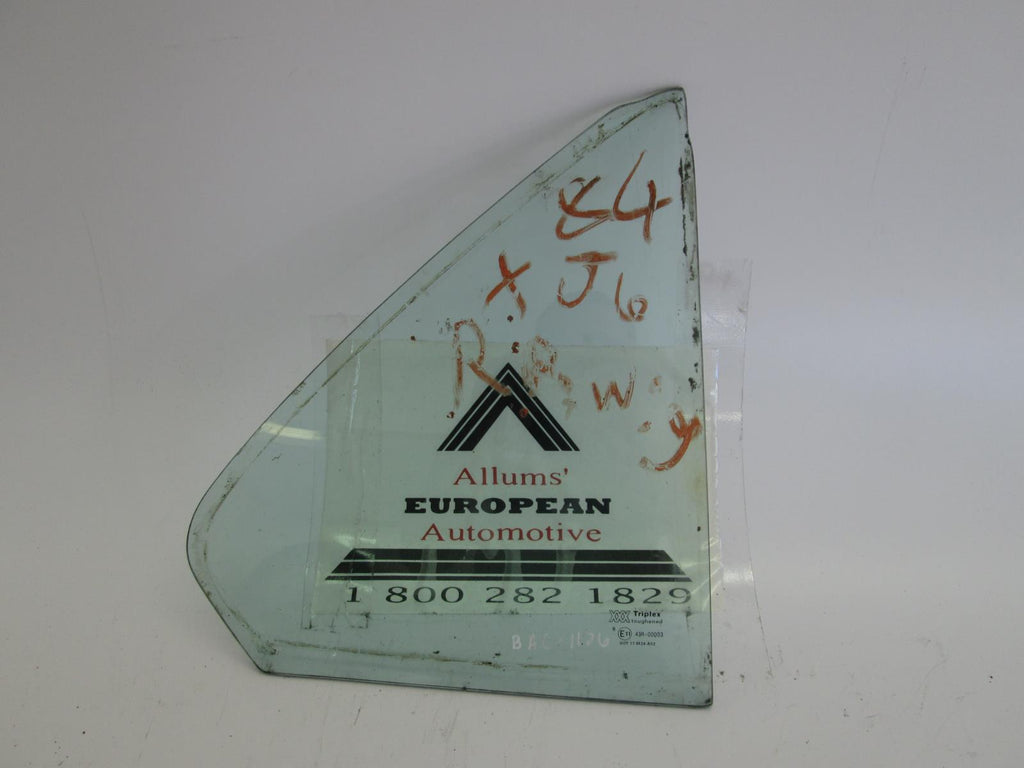 Jaguar XJ6 80-87 right rear quarter glass. The image is a stock picture of the item. We have many windows in stock and the one pictured may or may not be the one you receive. Windows may have tint, writing, seals, trim, or stickers that may need to be removed once you receive the window.